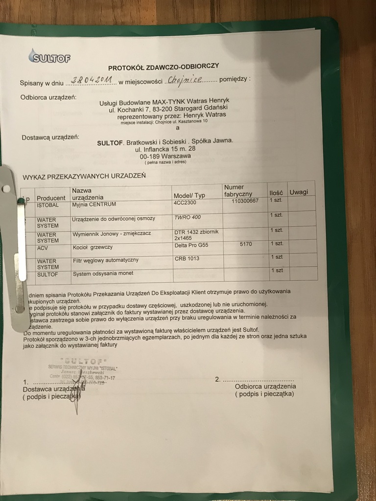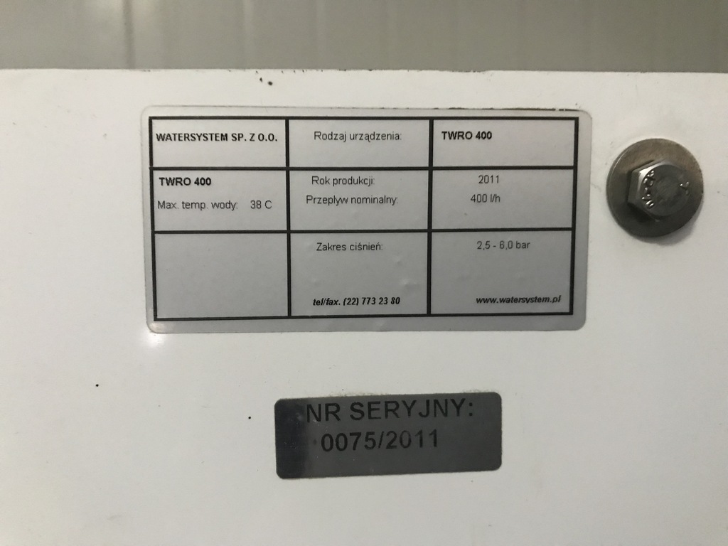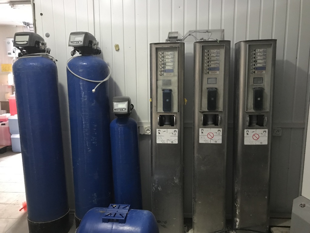 Urządzenia myjni 3-stanowiskowej firmy SULTOF, model 4CC2300 (ISTOBAL). System odwróconej osmozy TWRO 400 (Water System). Wymiennik jonowy – zmiękczacz DTR, 1432 zbiornik 2×1465 (Water System). Kocioł grzewczy DELTA PRO G55 (ACV). Filtr węglowy automatyczny CRB 1013 (Water System). System odsysania monet. Stan bardzo dobry!