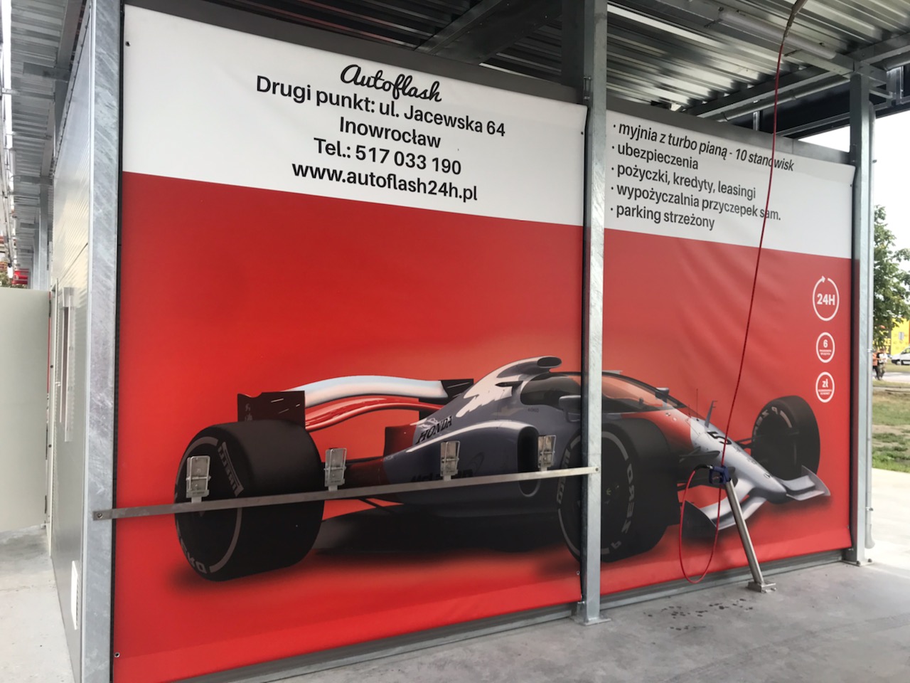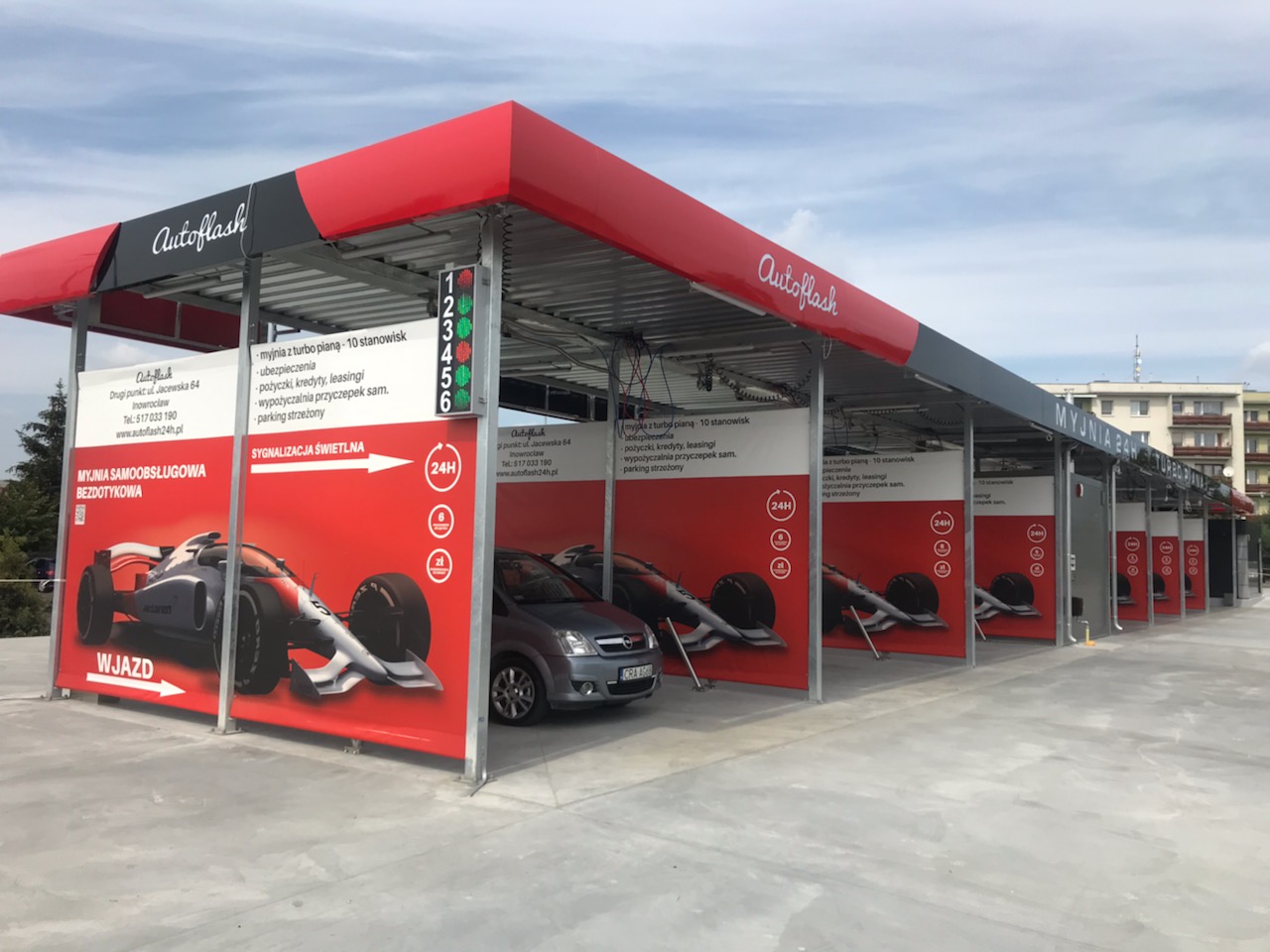 Dodatkowe funkcjonalności: SYGNALIZACJA ŚWIETLNA ( TABLICA Z NUMERAMI STANOWISK ) , PRZYGOTOWANIE POD MULTISERWIS , W ZAKRES MYJNI WCHODZI PARKING NA 60 AUT MONITOROWANY ELEKTRONICZNIE